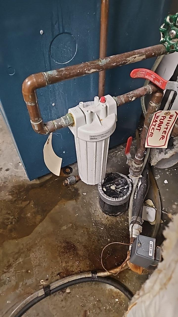 Close-up of a residential water filter leaking and causing water damage on a concrete floor in a utility room, indicating the source of a water loss.