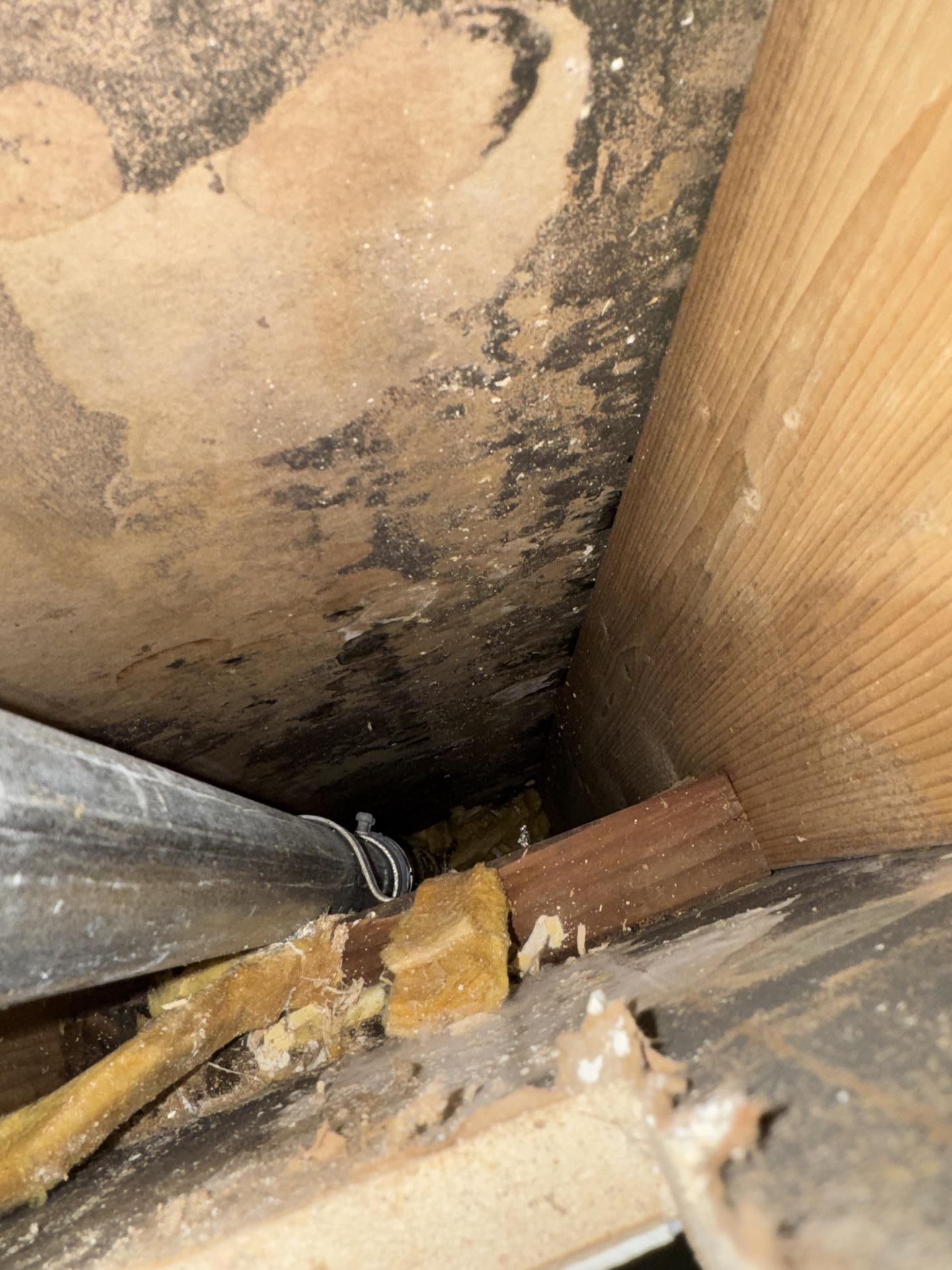 Close-up view of extensive mold growth on wooden structures and insulation in a hidden void behind a kitchen wall at Chili's.