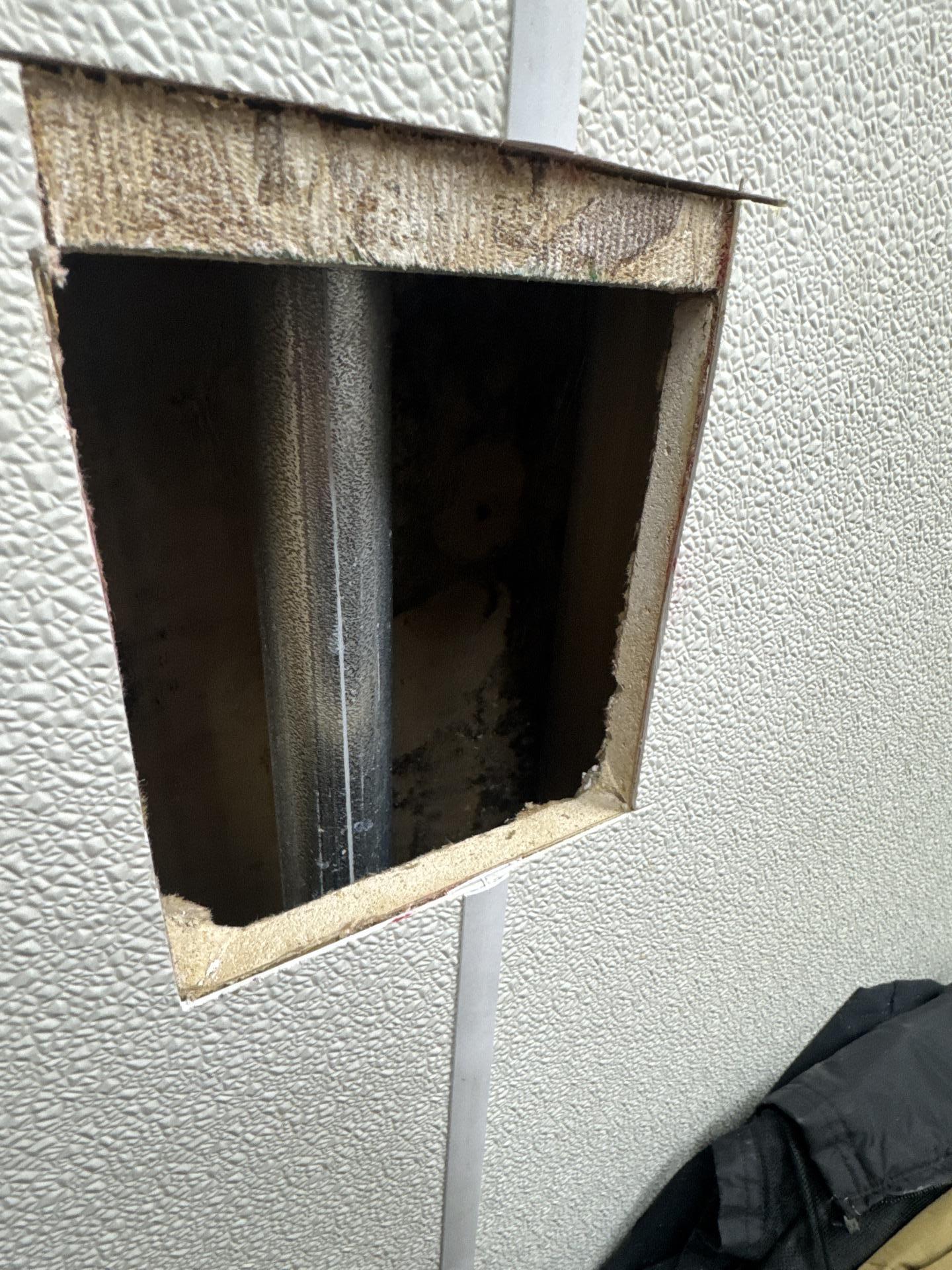 A square cut-out in a textured kitchen wall revealing a pipe and dark mold staining within the wall cavity.