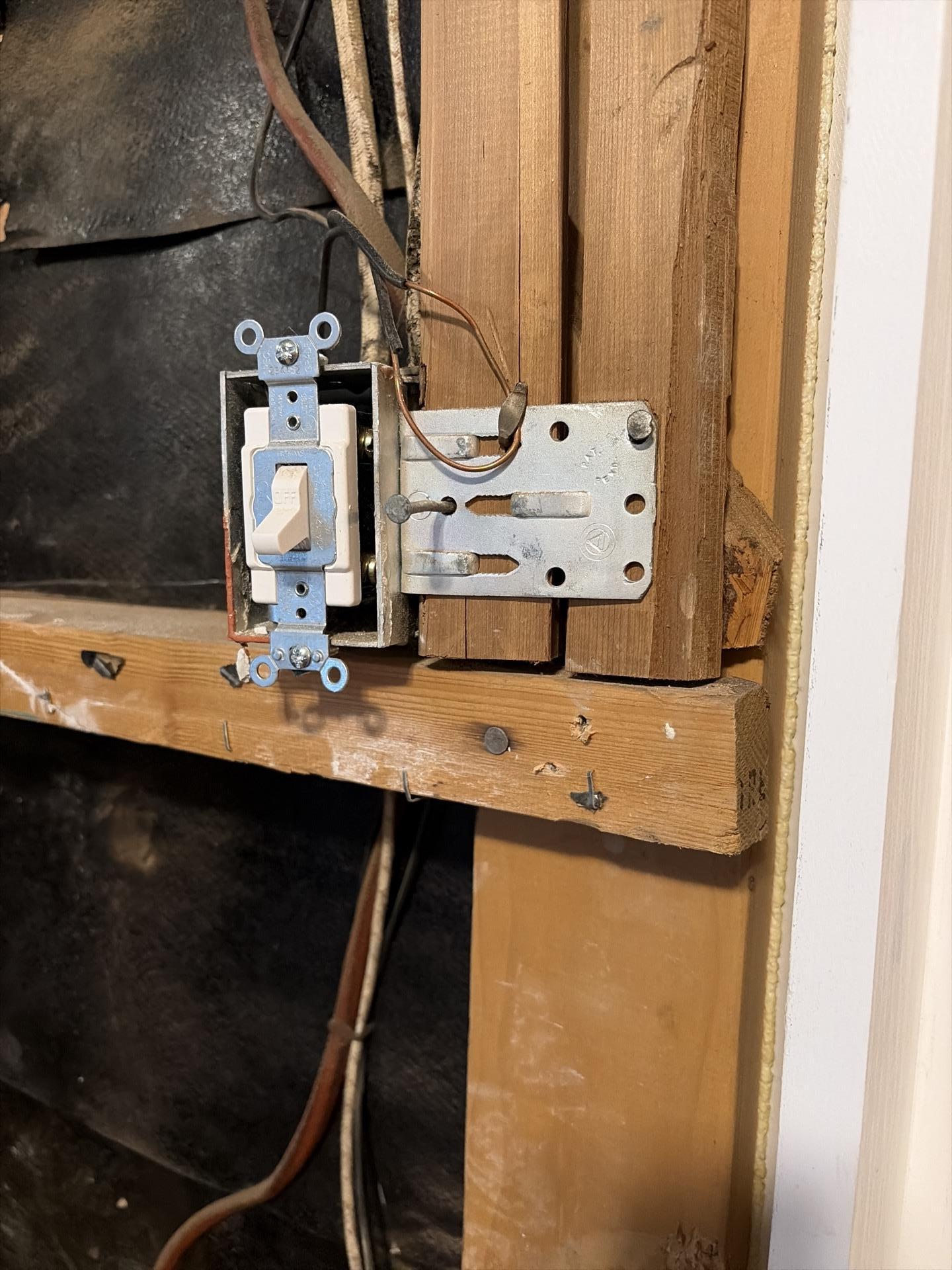 Close-up of electrical wiring and a light switch within an exposed interior wall cavity during a renovation or restoration.