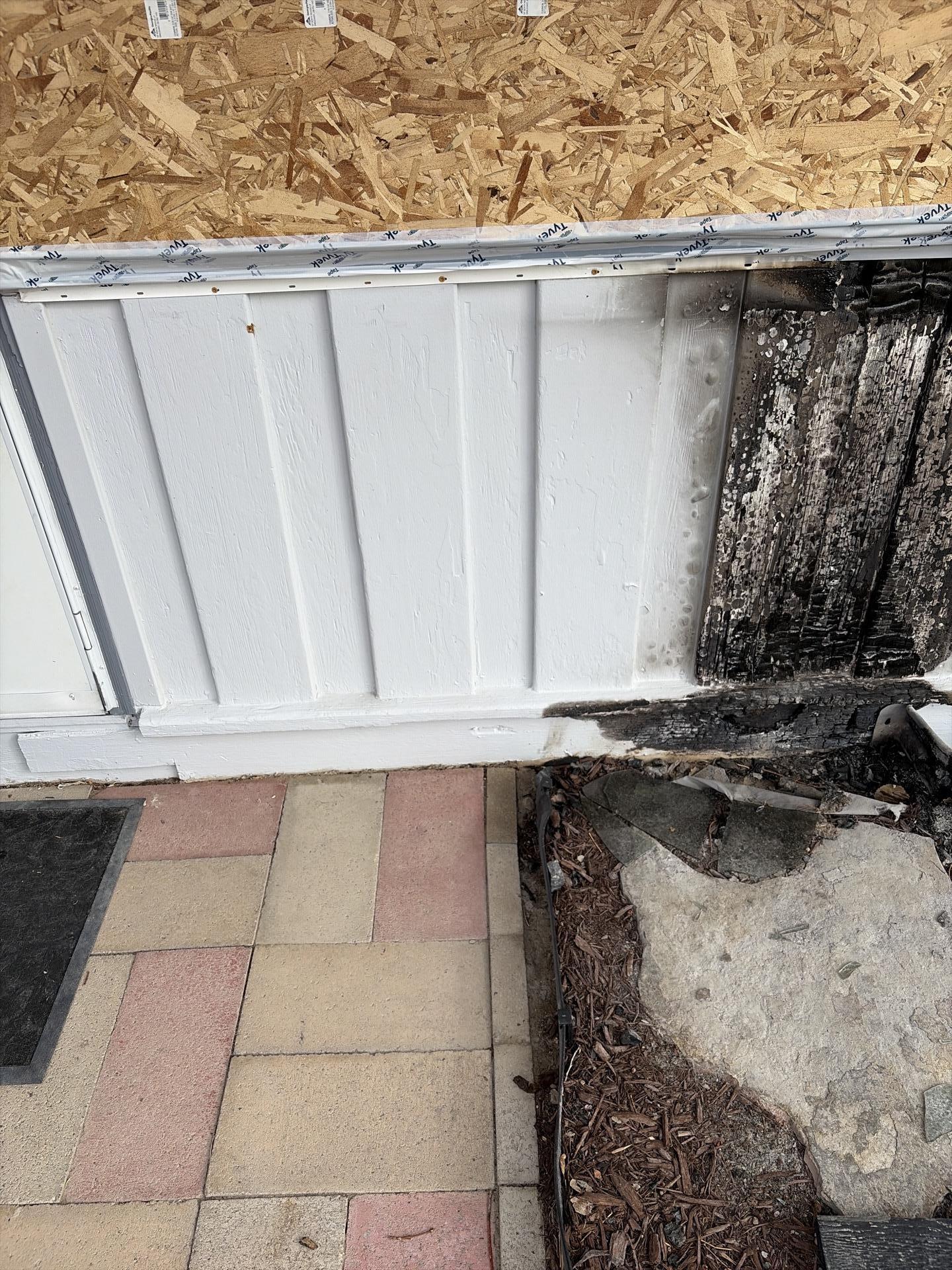Exterior view showing damaged siding next to newly installed white siding and plywood during exterior wall reconstruction.