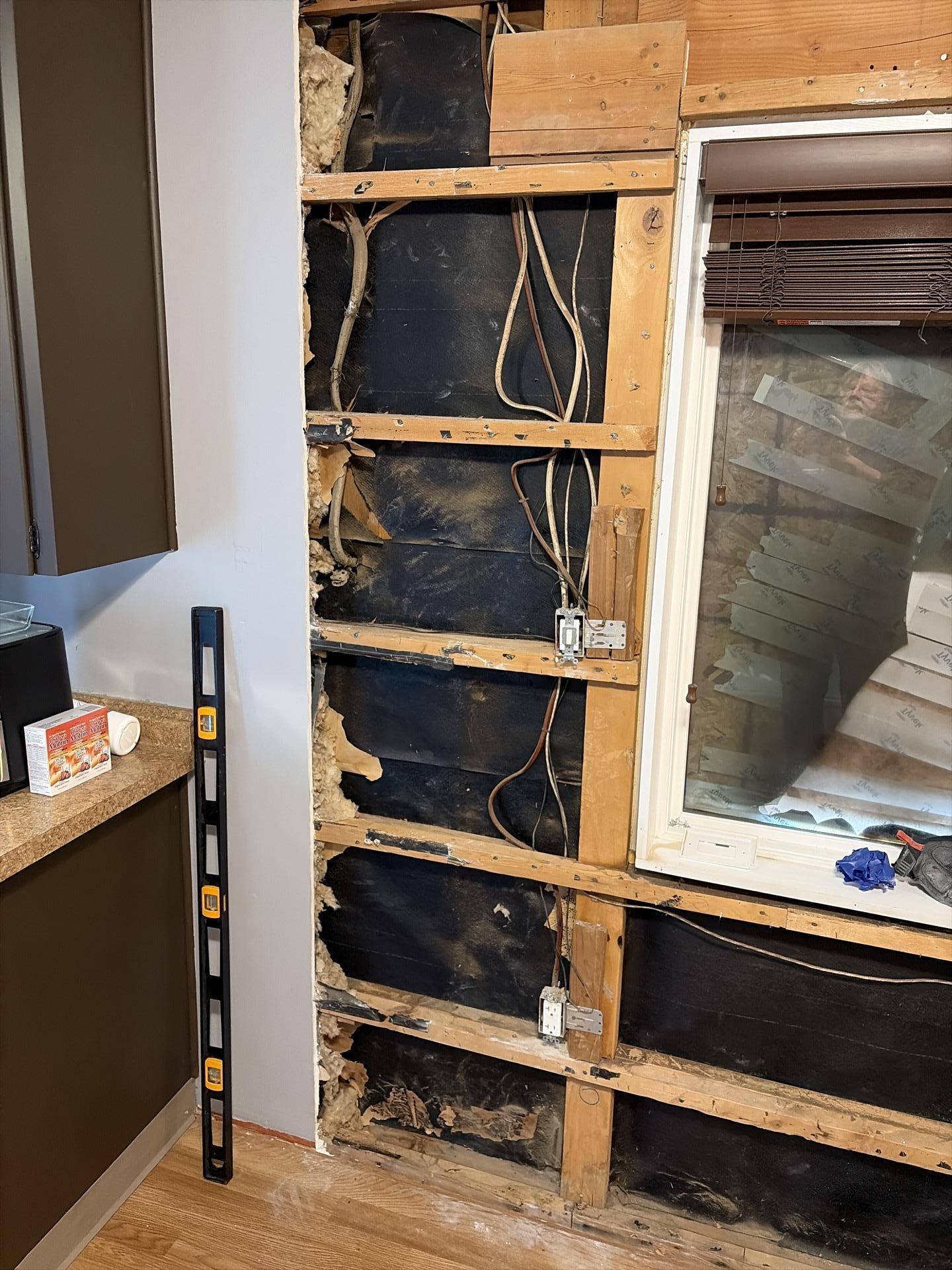 Interior wall stripped down to exposed studs and wiring during a property damage restoration project, showing a level tool on the left.