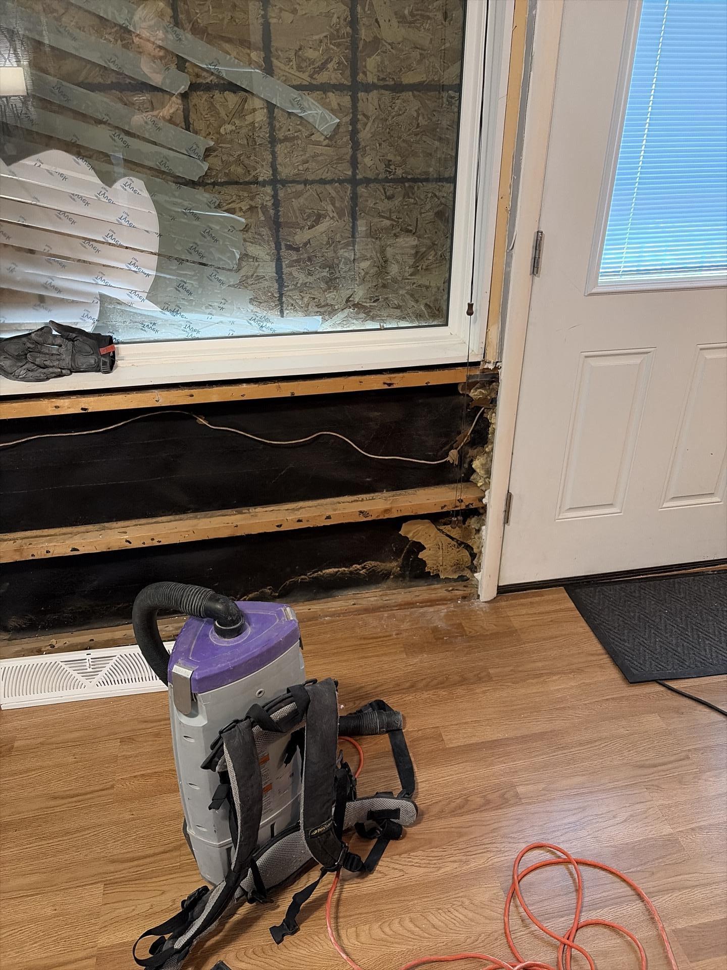 Interior wall after demolition for water damage restoration, revealing exposed wood framing, a window, and a door, with a backpack vacuum cleaner on the floor.