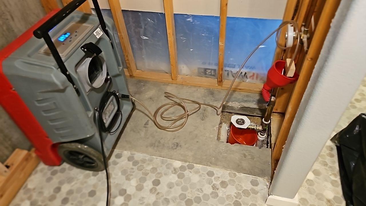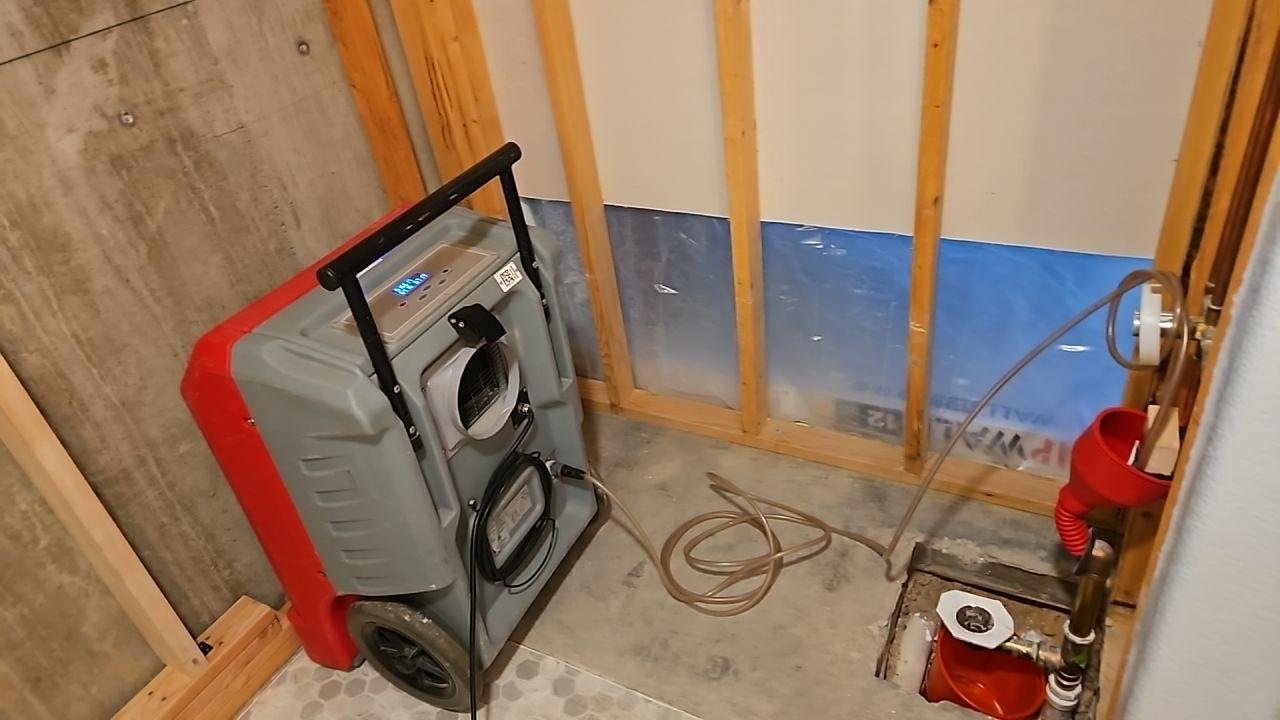 Another view of the dehumidifier and exposed plumbing, actively drying moisture from a sewer backup.