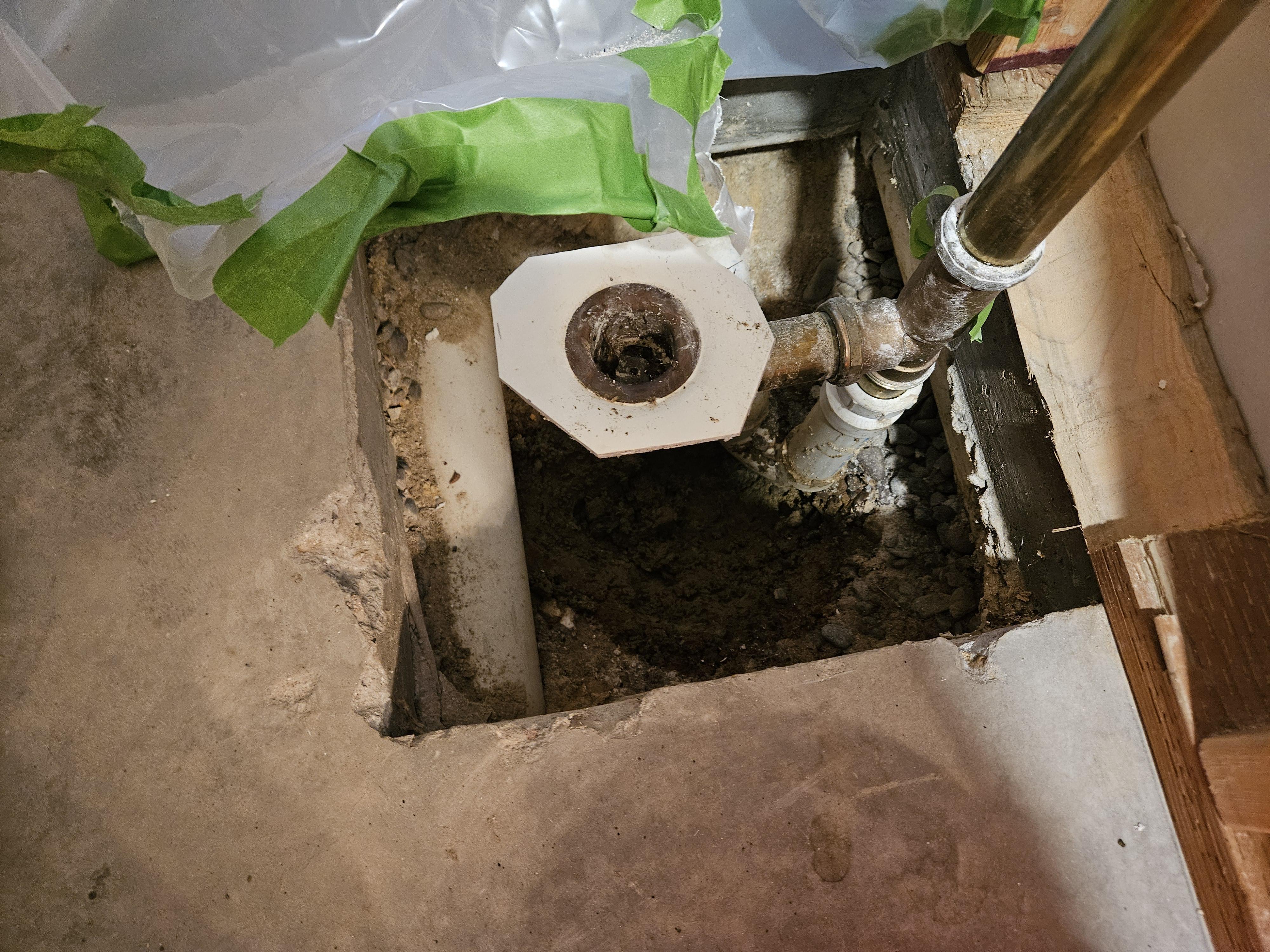 Close-up of the exposed tub drain and plumbing showing the source area of the small sewer backup.