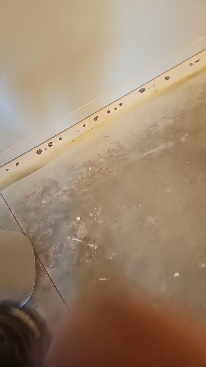 Evidence of water damage and potential mold growth on bathroom floor from sewer backup near tub drain.