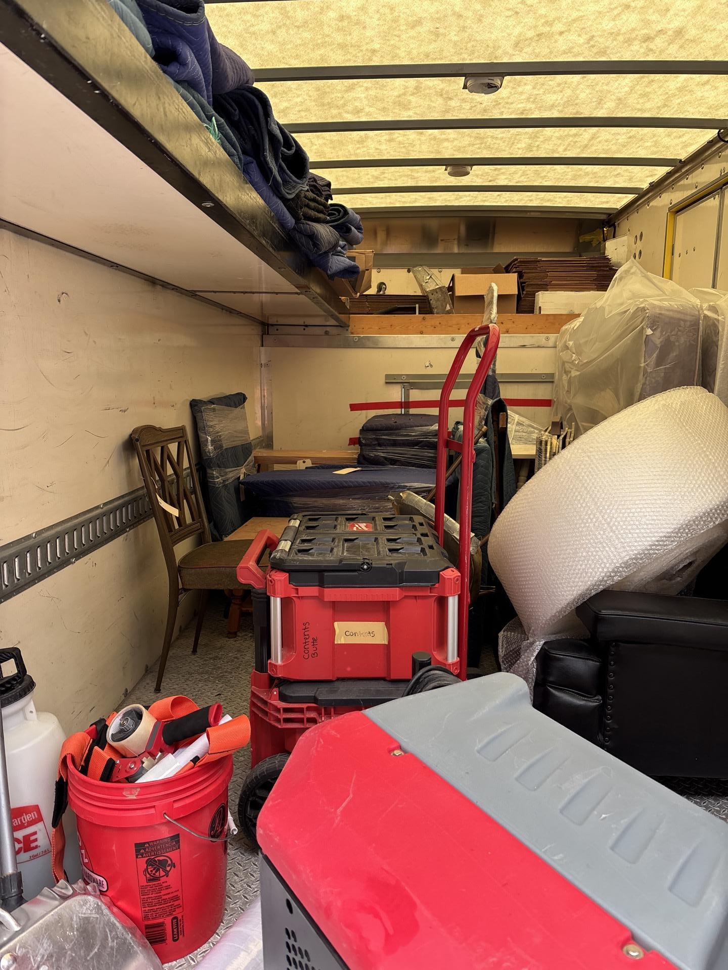 Securely packed furniture and household items inside a restoration truck for safe off-site storage.
