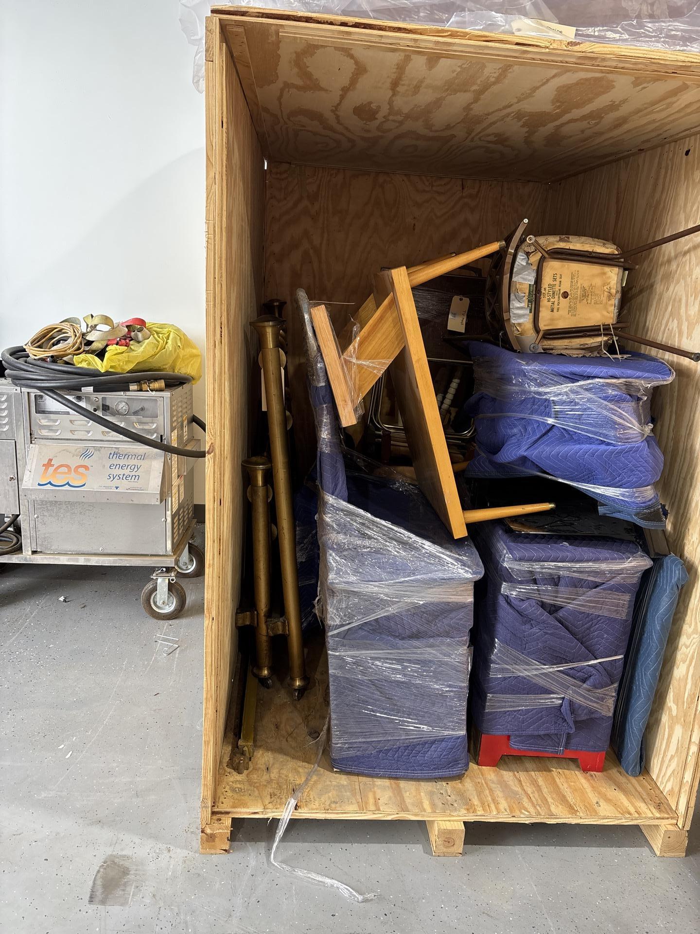 Wrapped furniture stored in specialized wooden crates with thermal energy drying systems for protection.
