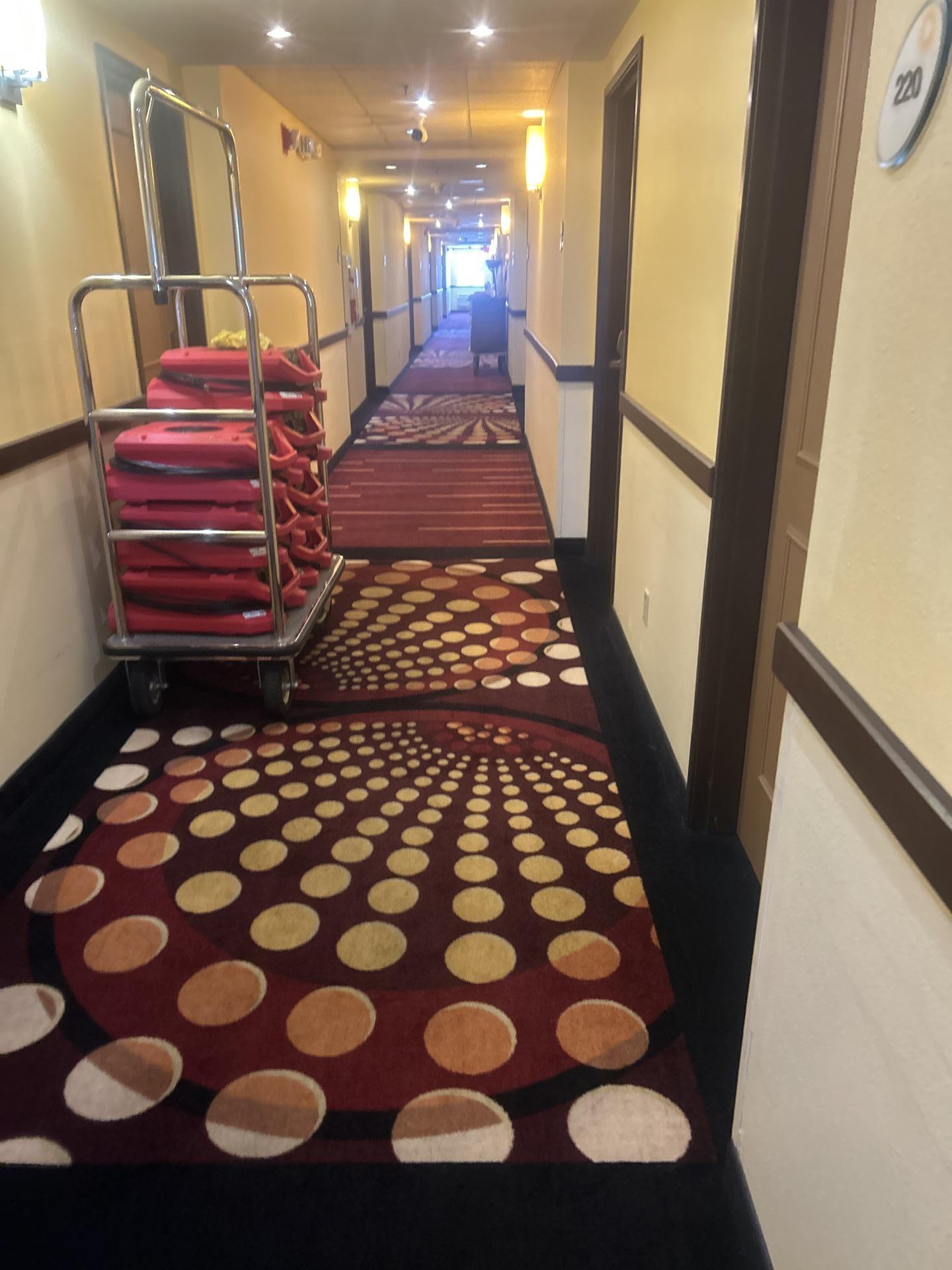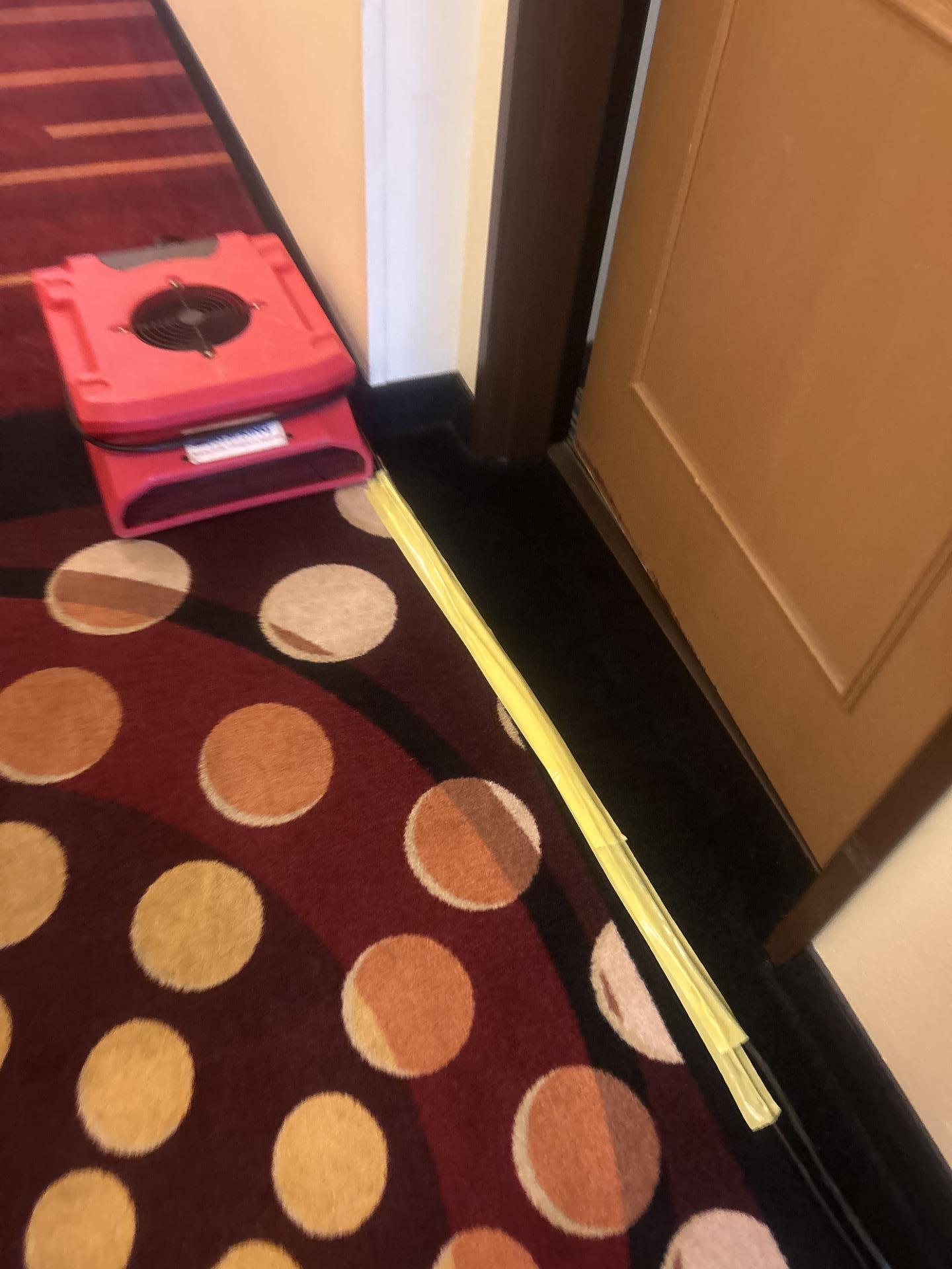 Red air mover and yellow containment barrier in a hotel hallway carpet for water damage drying.