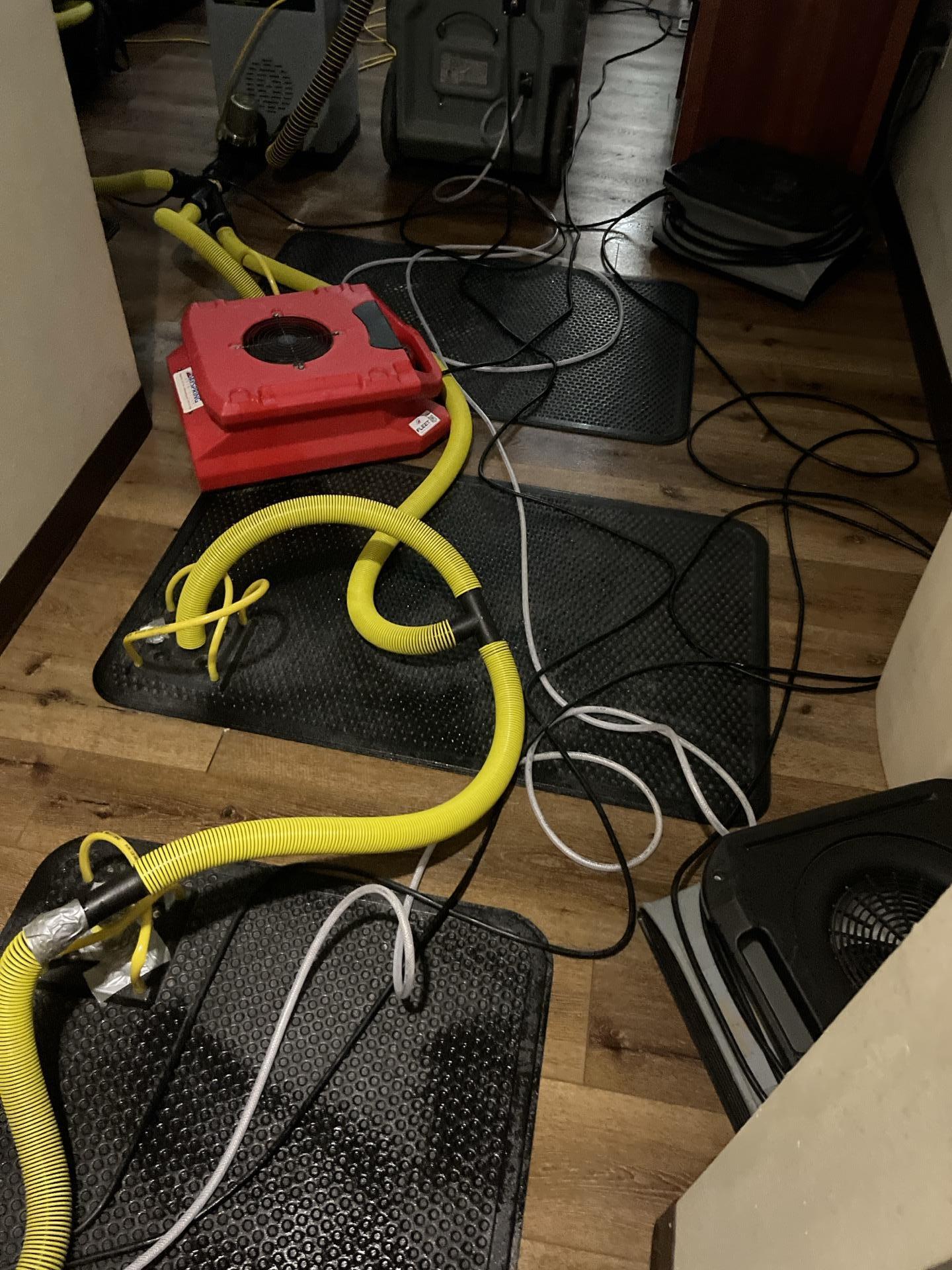 Provided comprehensive water damage restoration services, including immediate deployment of professional drying equipment such as air movers and specialized drying mats/hoses. The team efficiently set up and managed the drying process to mitigate moisture and restore the affected areas in the commercial hallway and rooms.