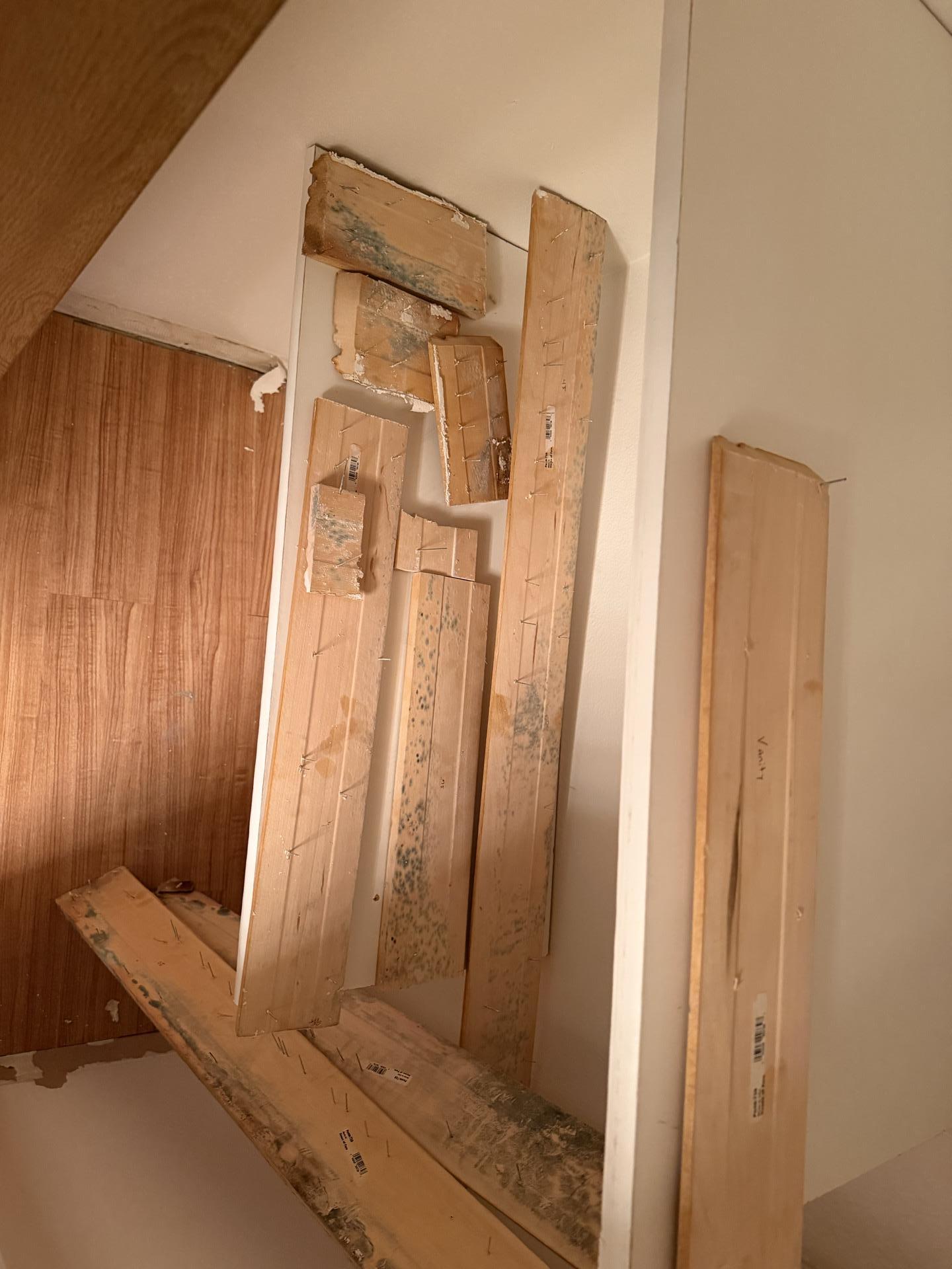 The customer experienced significant water damage within their property, leading to structural damage and the growth of mold on various wooden elements, necessitating professional intervention to mitigate further issues and restore the affected areas.