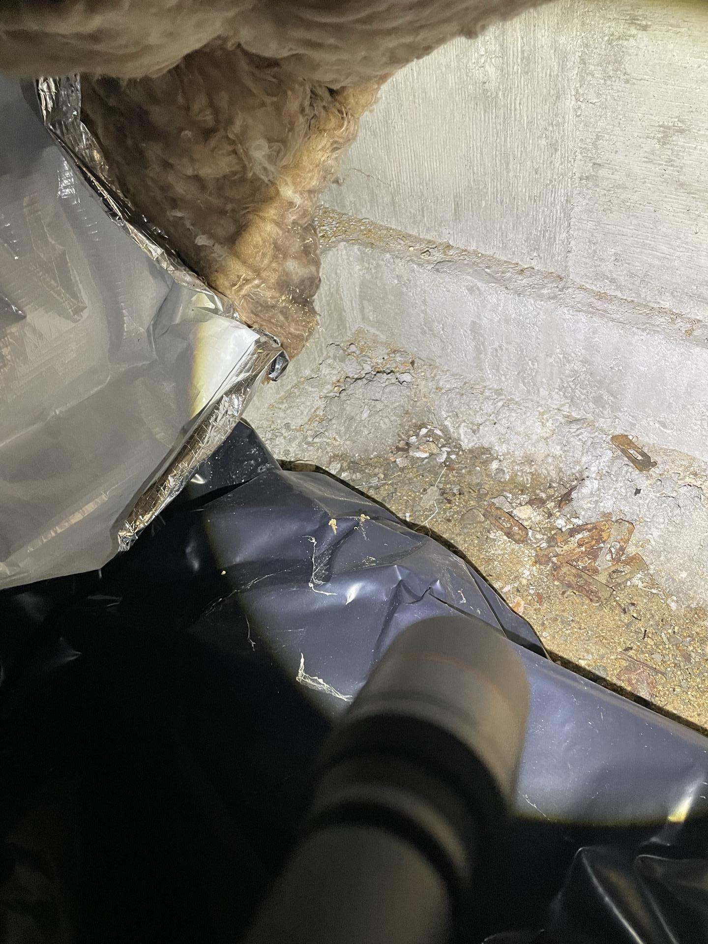 Another view of moisture damage and efflorescence on a crawl space foundation wall, with insulation above and a flashlight illuminating the area.