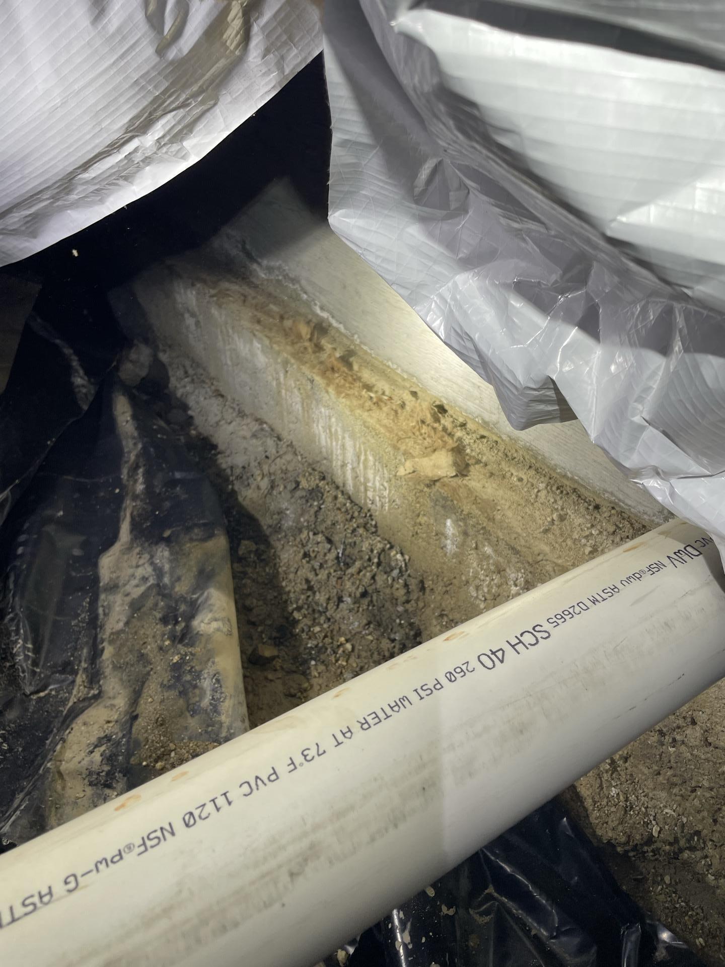 Close-up view of water damage and efflorescence on a concrete foundation wall in a crawl space, with dirt and a PVC pipe.