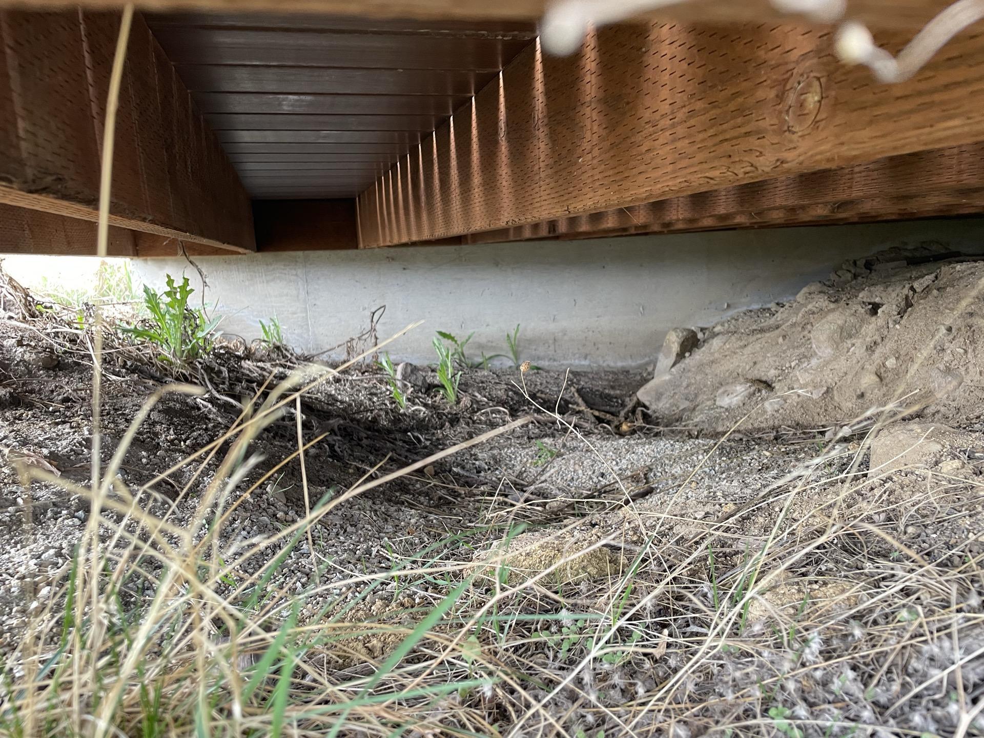 Exterior view looking into a residential crawl space, showing wooden floor joists, dirt, and some vegetation outside.
