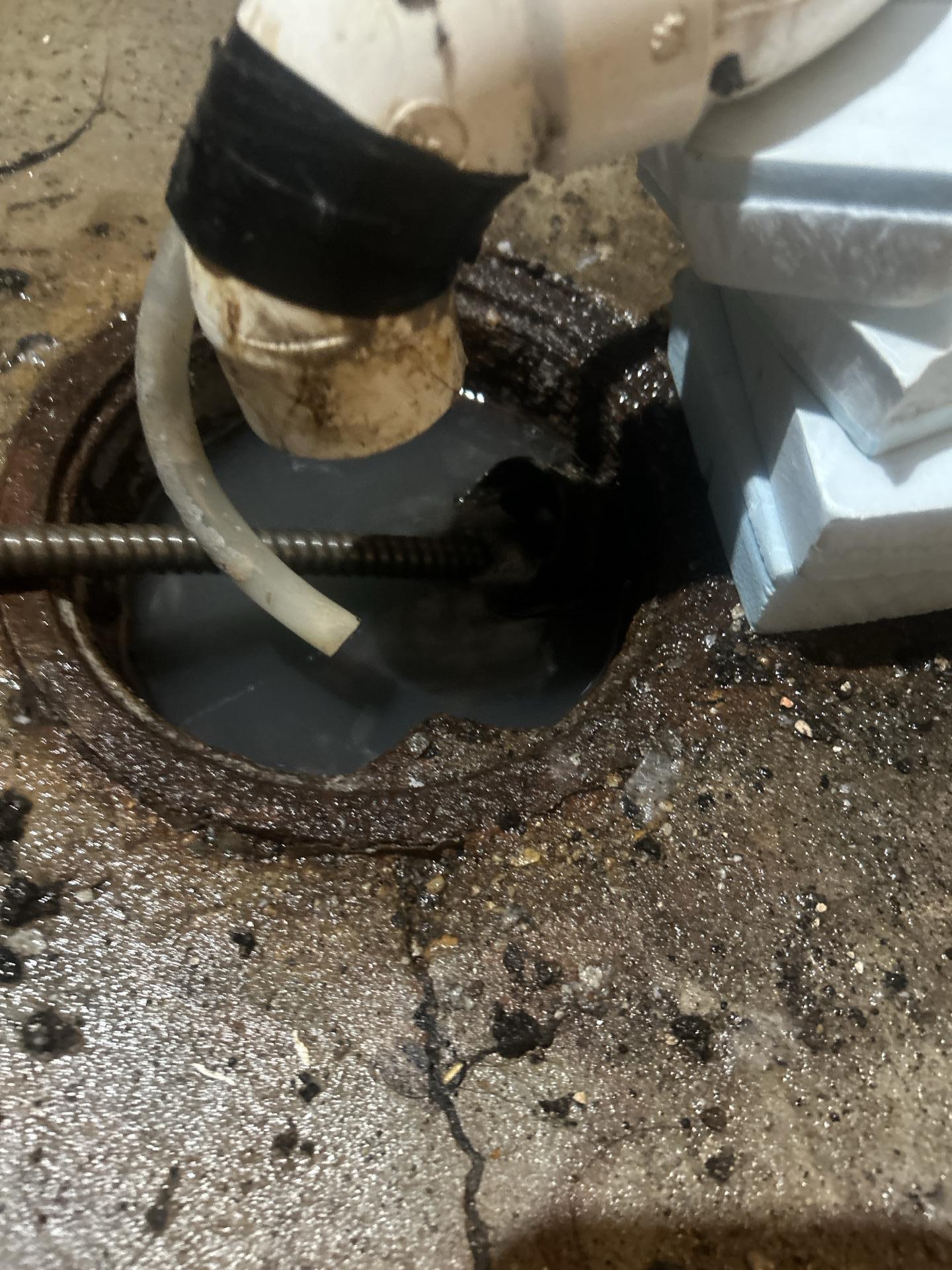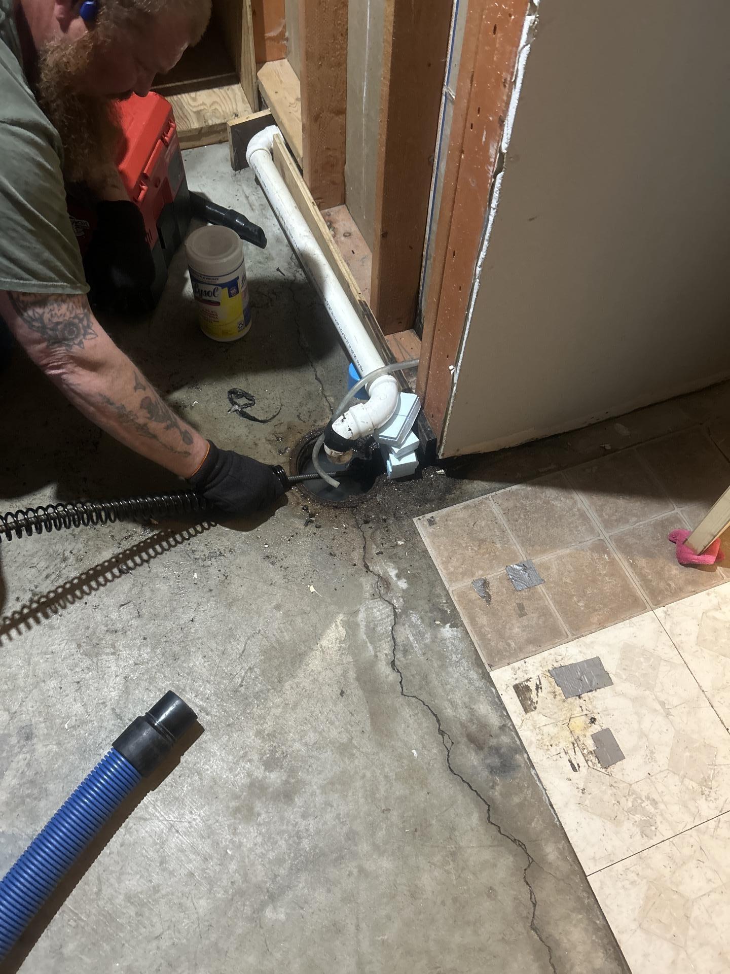 Plumbing technician uses an auger to clear a clogged basement floor drain during repair.