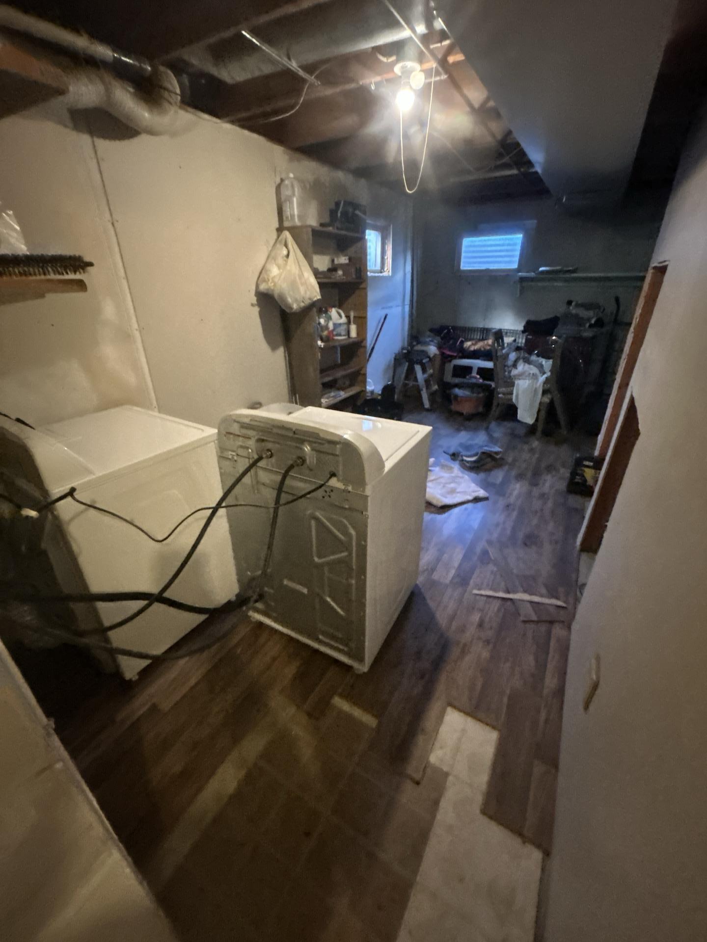 A basement laundry room undergoing floor repairs with exposed subfloor and cluttered surroundings.