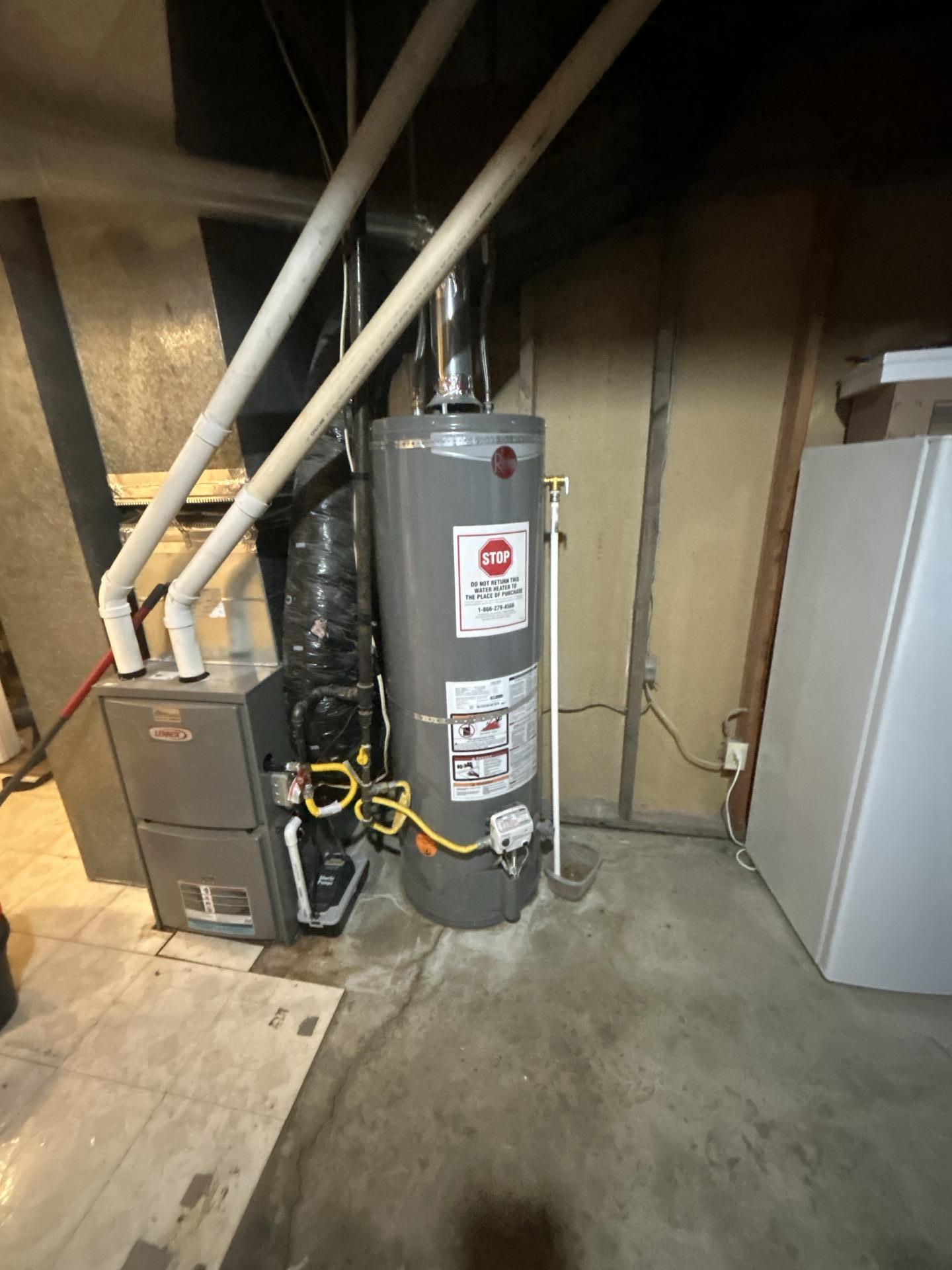 A professional installation of a grey water heater and furnace in an unfinished basement.