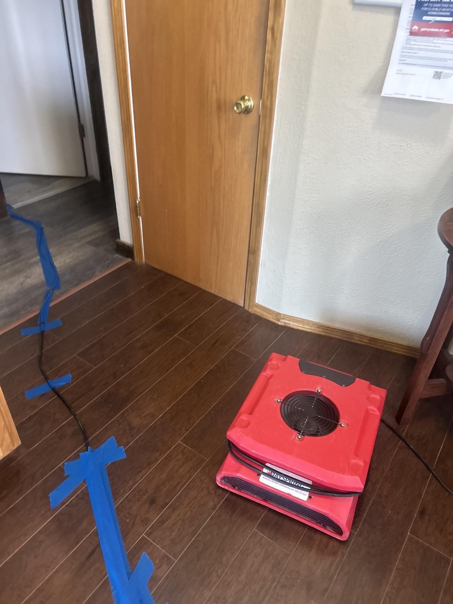 Red industrial air mover drying dark wood floors after professional water damage restoration services.