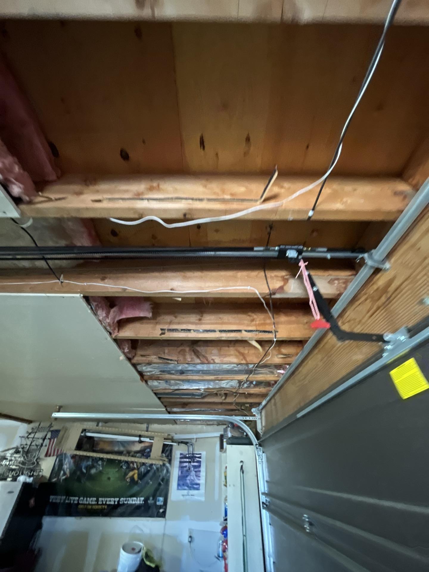 Exposed wooden ceiling joists and pink fiberglass insulation in a residential garage repair site.