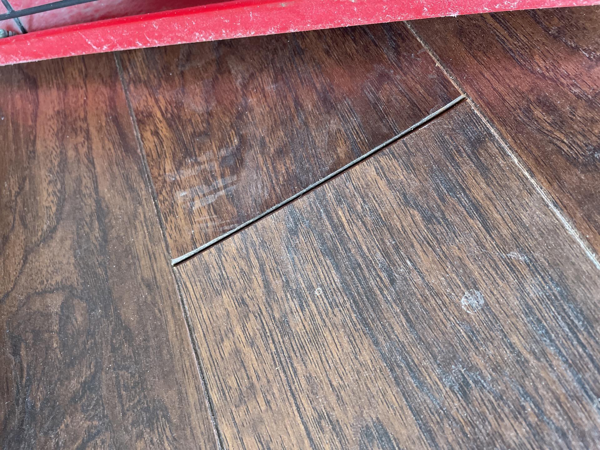 Visible gap between dark wood laminate floor planks that requires a professional floor repair.