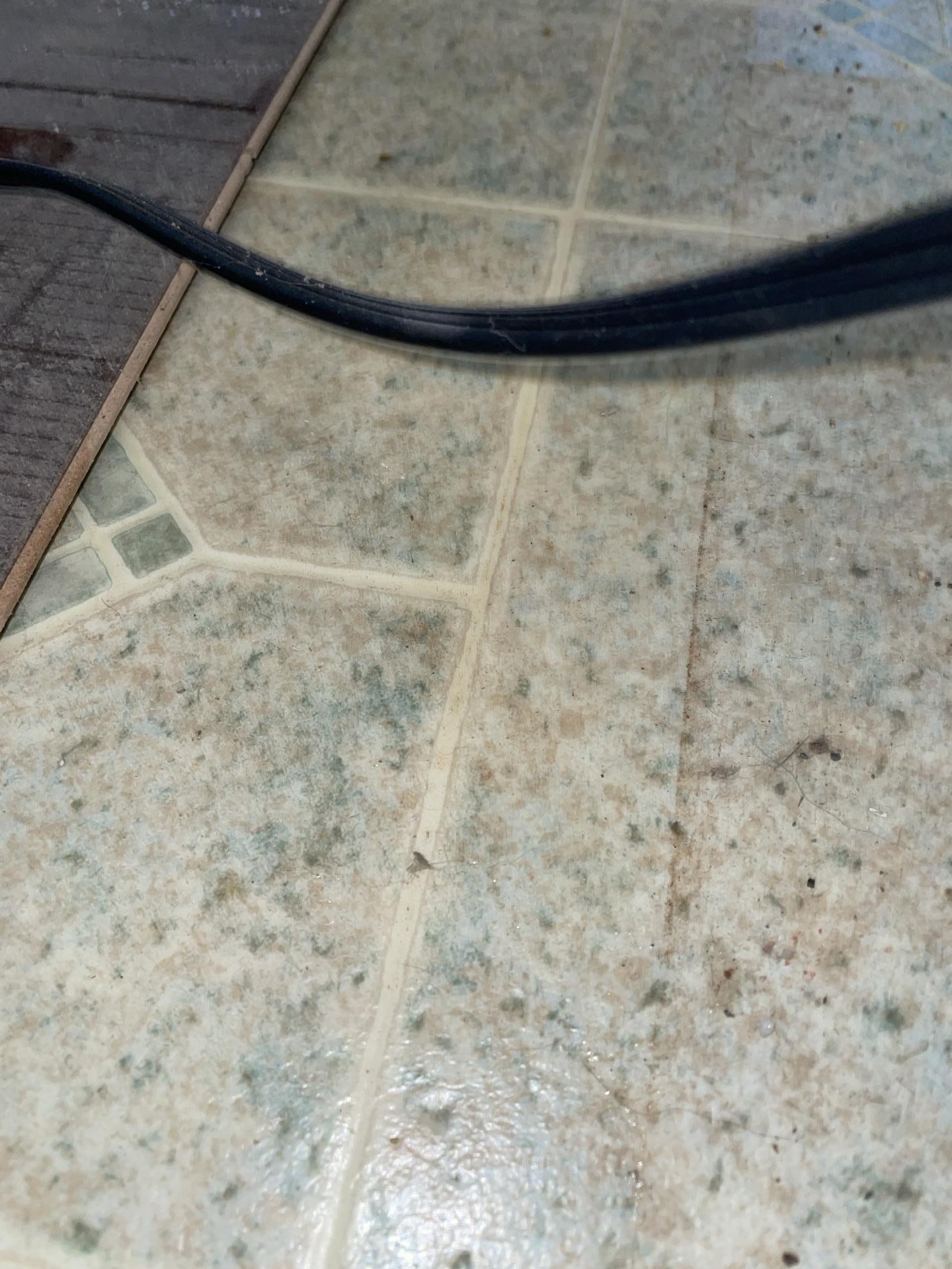Visible dark mold spots and dirt accumulating on the surface of patterned linoleum tile flooring.